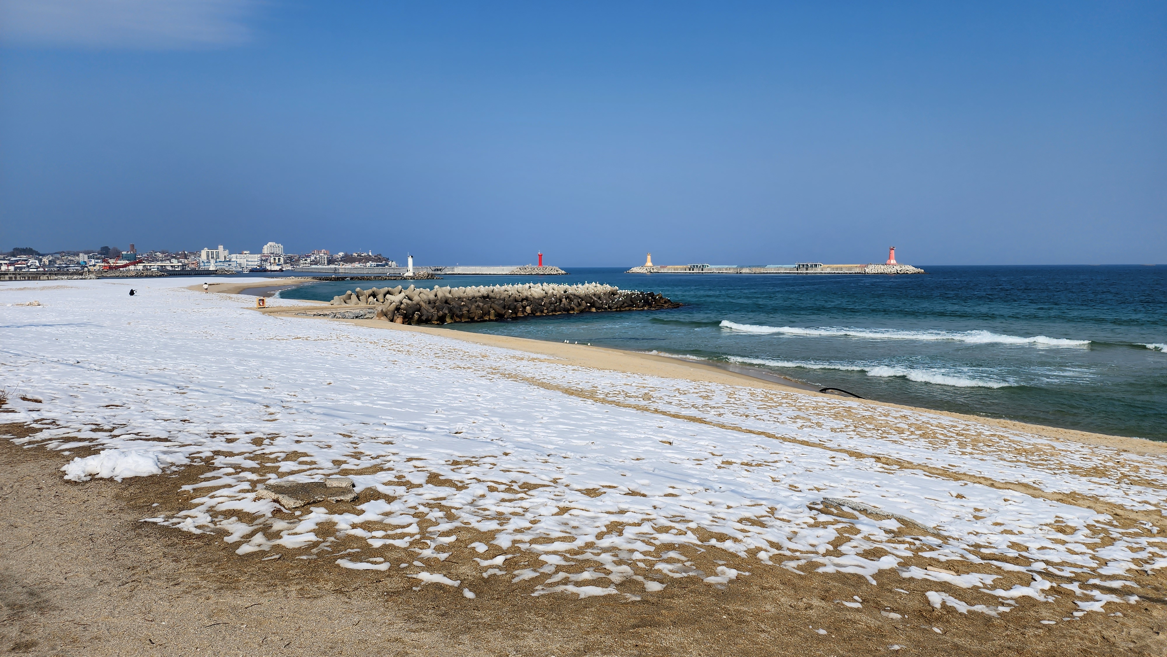 전날 눈이 와서 그런지 해변이 조금 더 이쁘게 보이는것 같다.