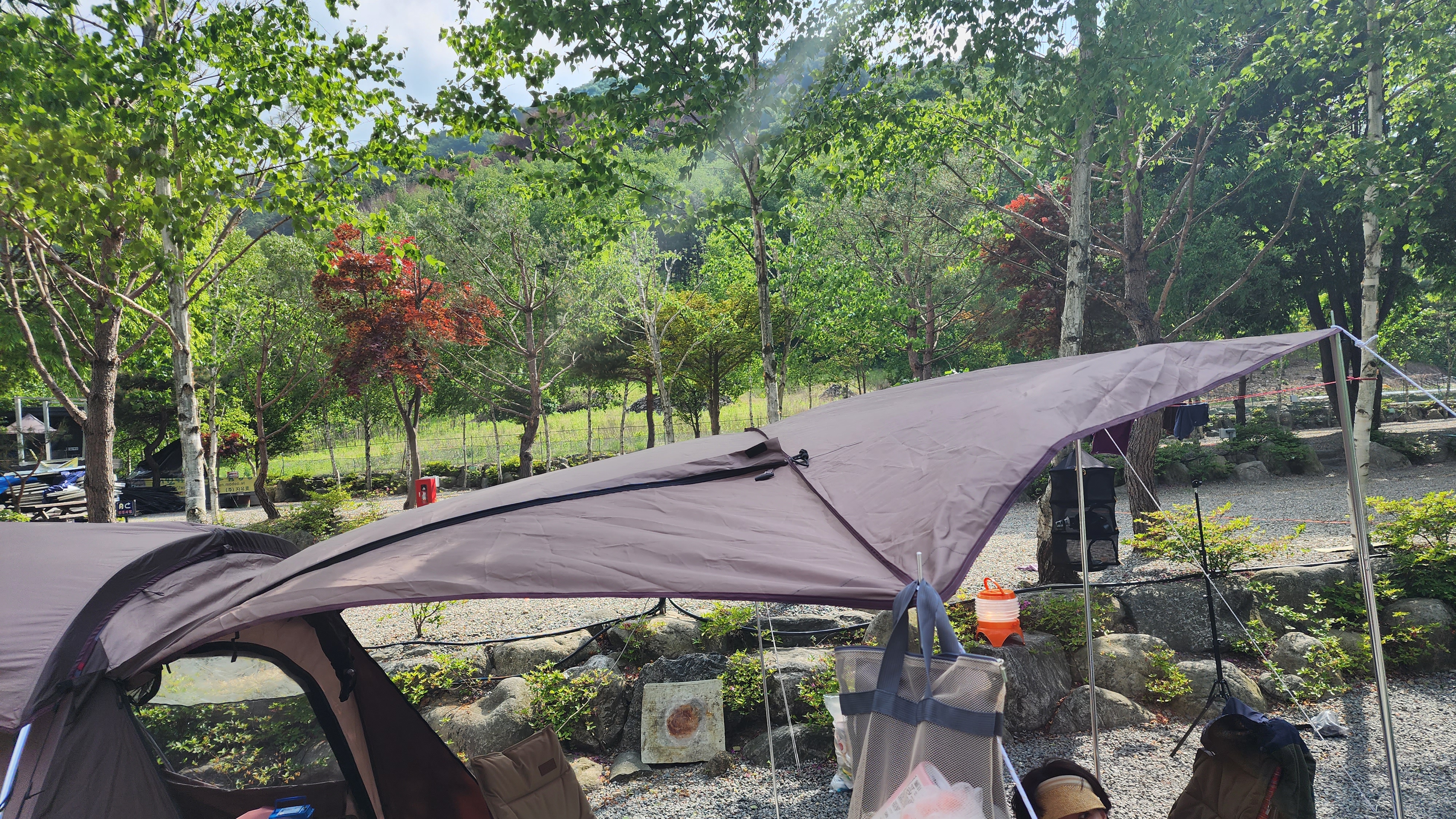 아쉬운건 블랙코팅이 안되어 있어 한여름에는 조금 힘들것 같다. 얇은 타프라서 나무그늘이 아니면 더울것 같다.