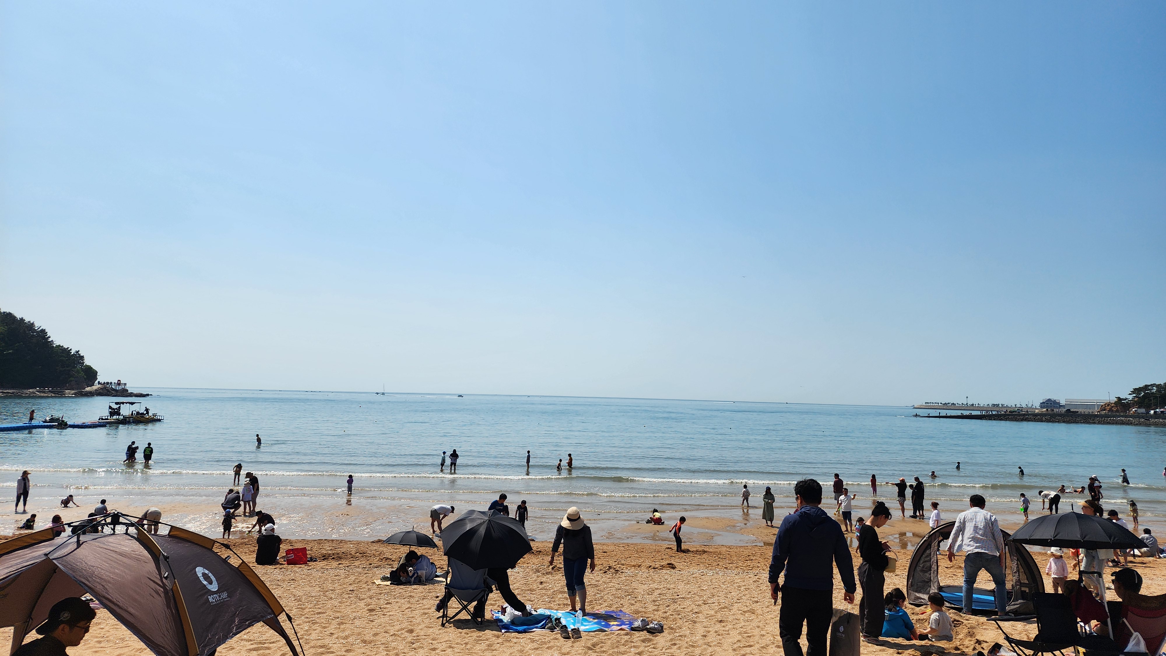 날씨가 좋다. 햇빛은 여름날씨다. 기온이 27도정도라서 물에는 들어가기 어렵지만 해수욕장에서 아이들과 뛰어놀기 너무 좋은 날씨다.