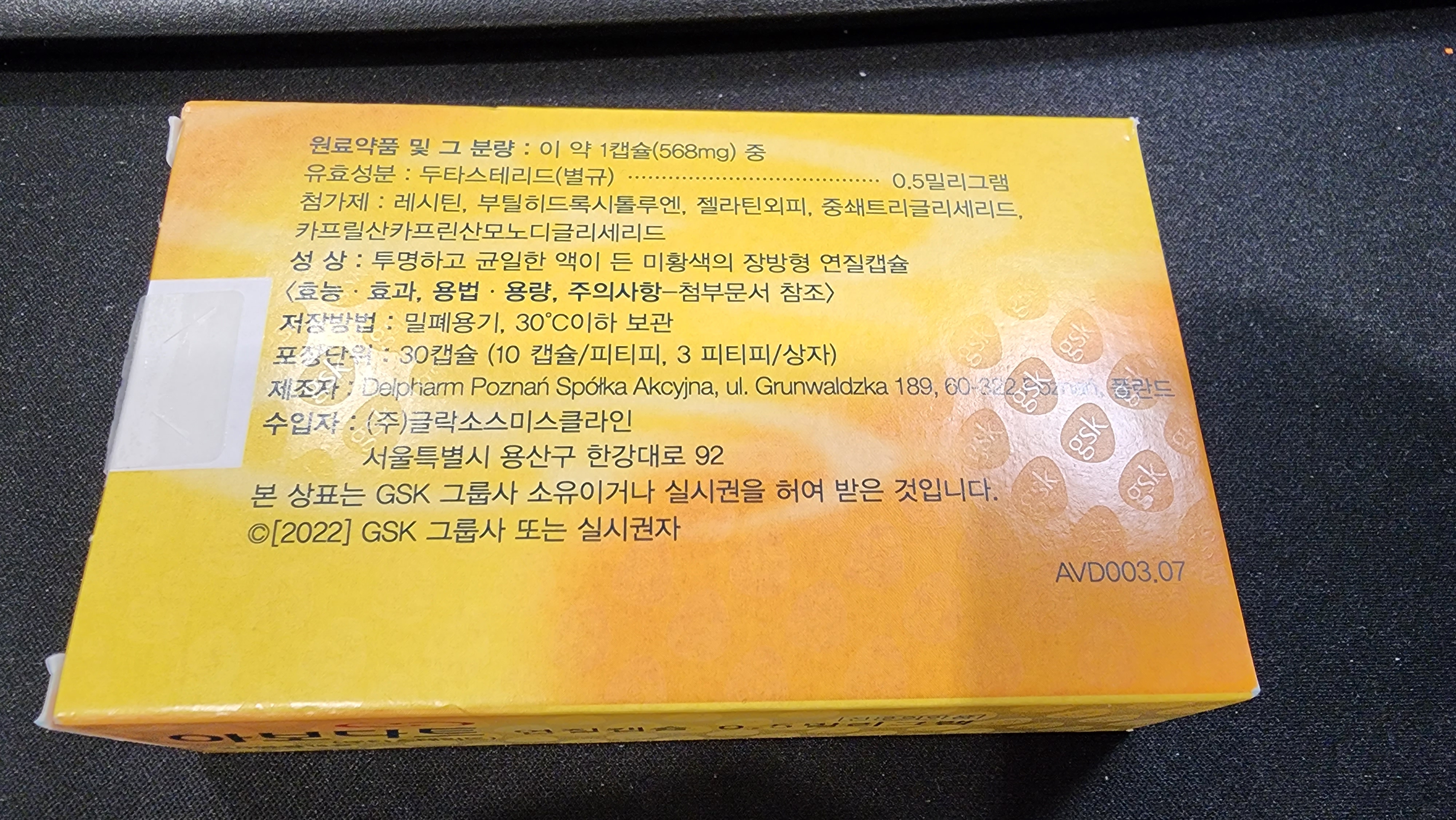 탈모약 중에서 하나인 아보다트 두타스테리드 0.5밀리그램 처방을 받고 구입했다.