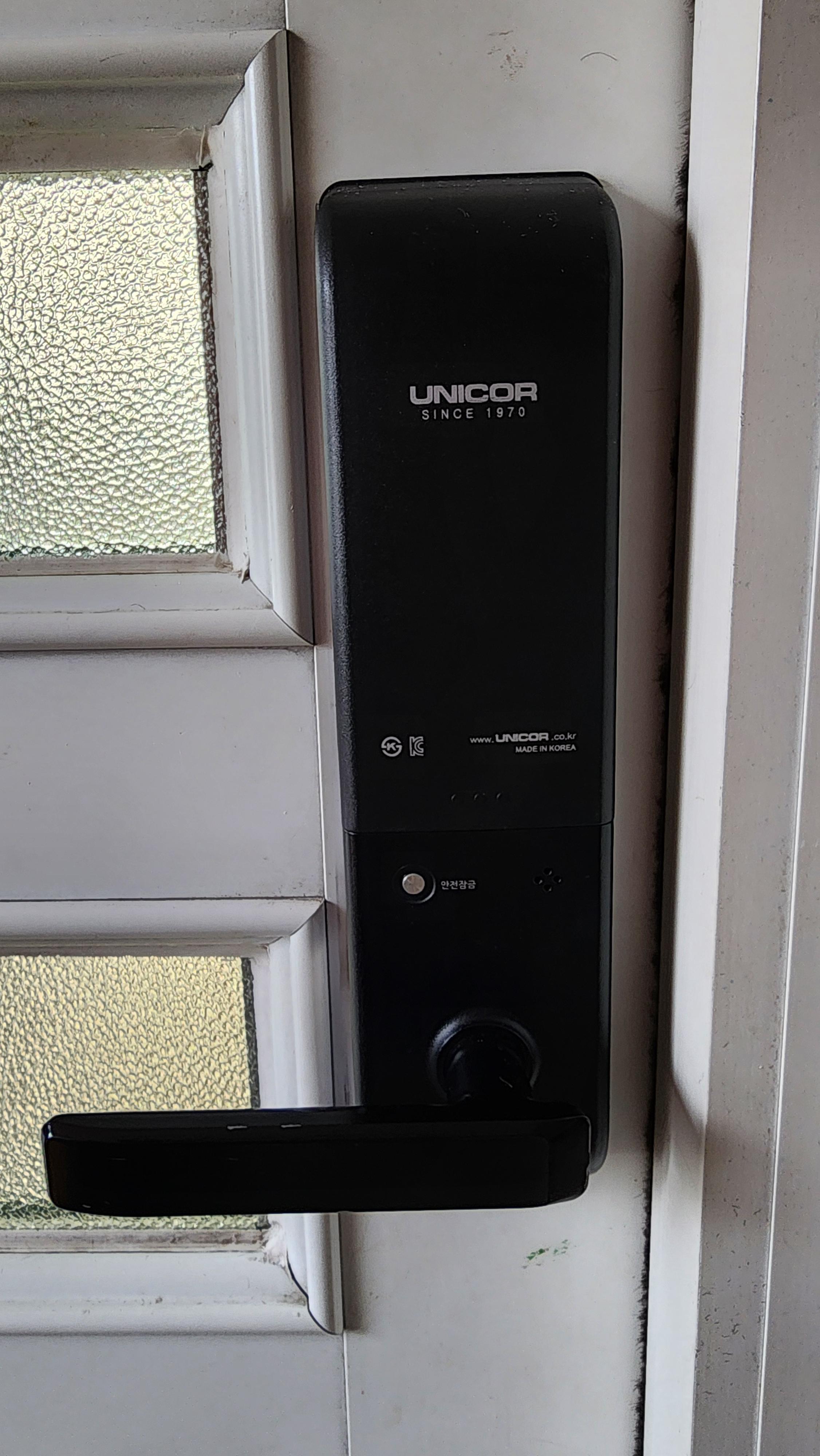 삼성 디지털도어락을 사용하다 비슷하지만 조금 다른 유니코 디지털도어락 손잡이 일체형 제품으로 사용법은 비슷하다.