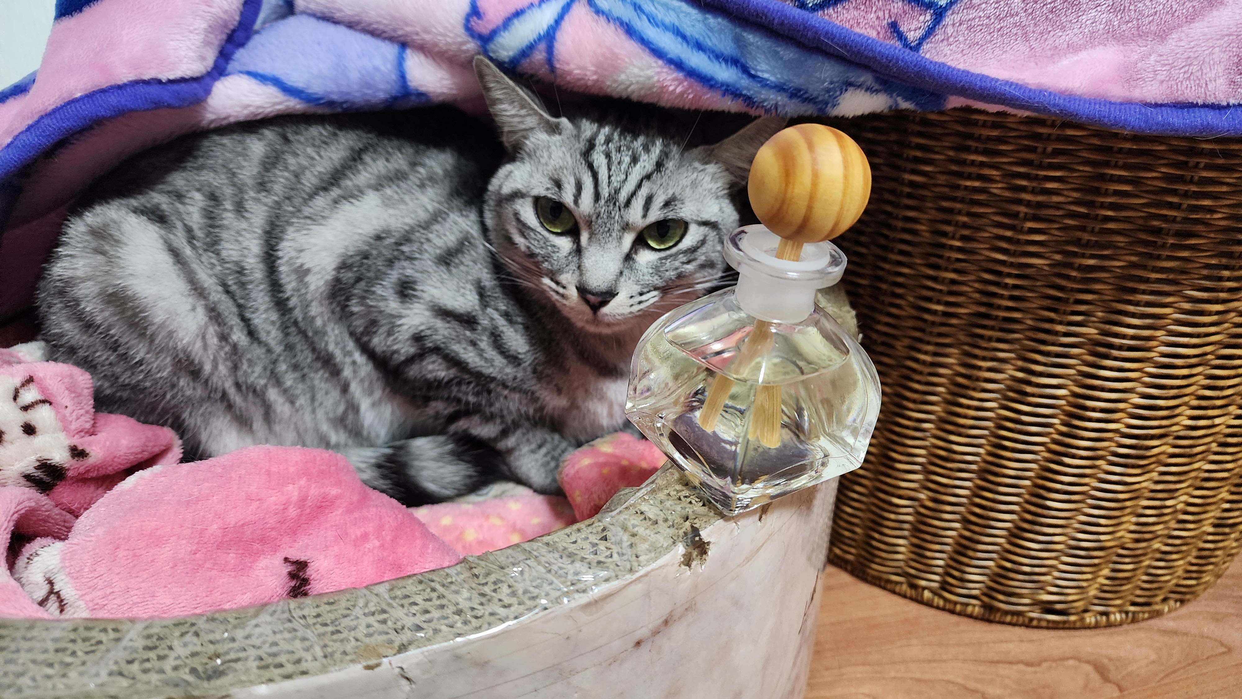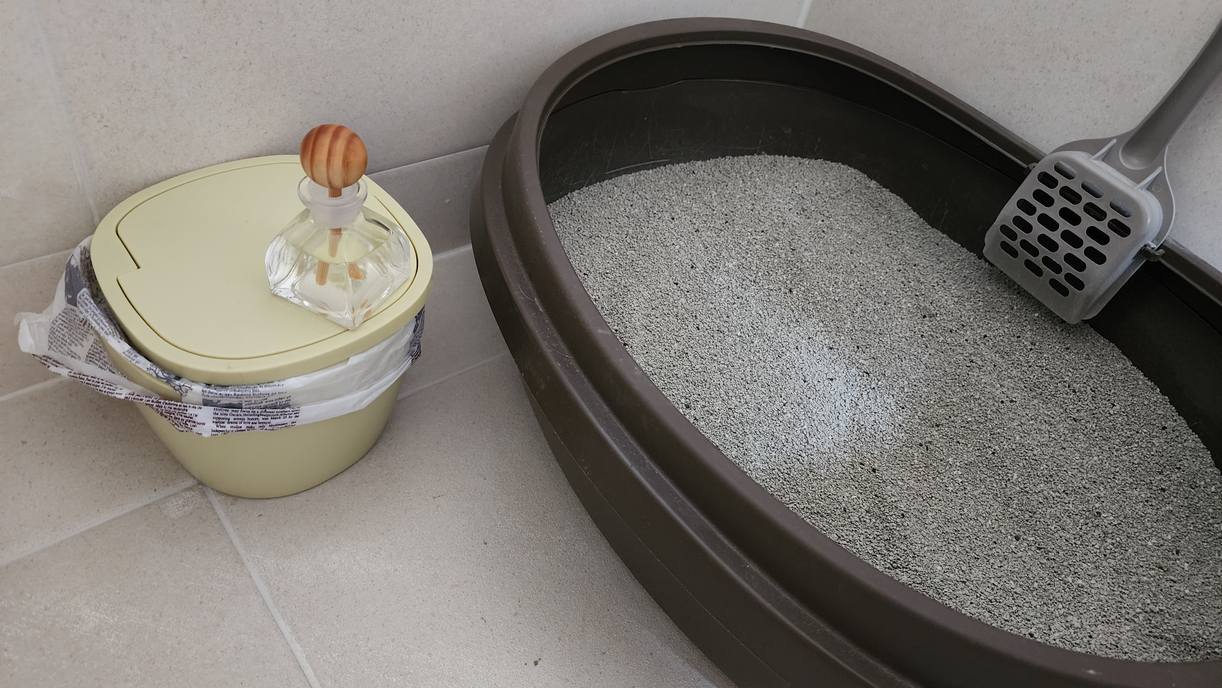 결국, 차량용 방향제 중 하나를 고양이 화장실에 두기로 했다.