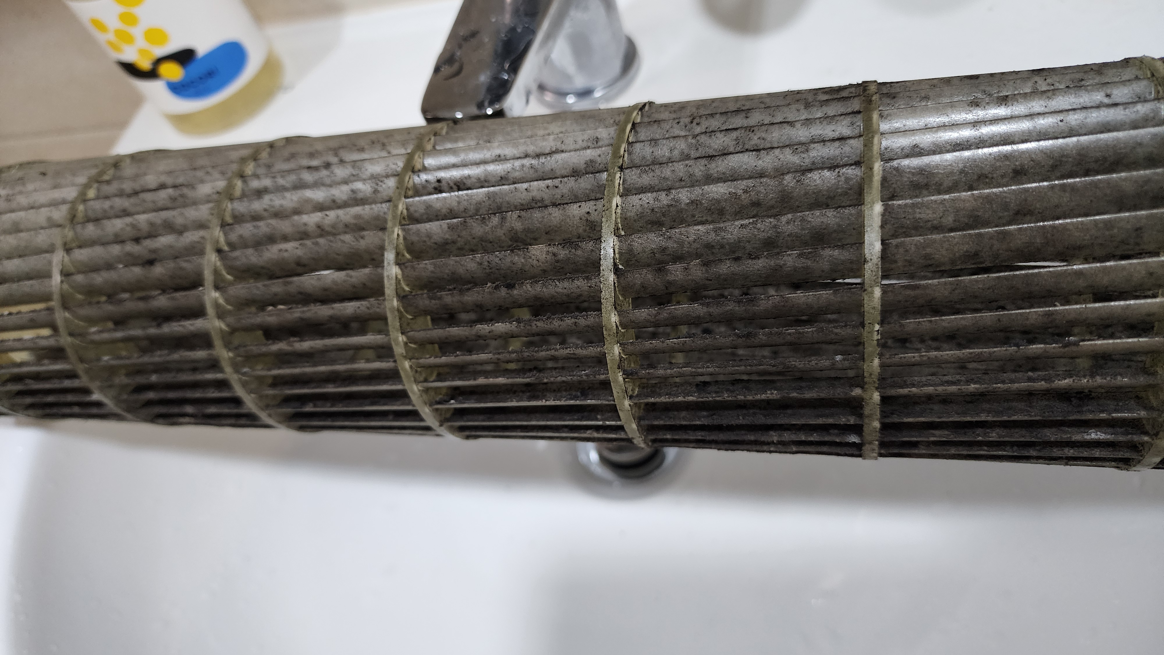 검은곰팡이가 사이사이 다 끼여있다. 손으로 살짝 만져도 다 뭍어 나올정도로 심각한 상태의 에어컨 팬이다.