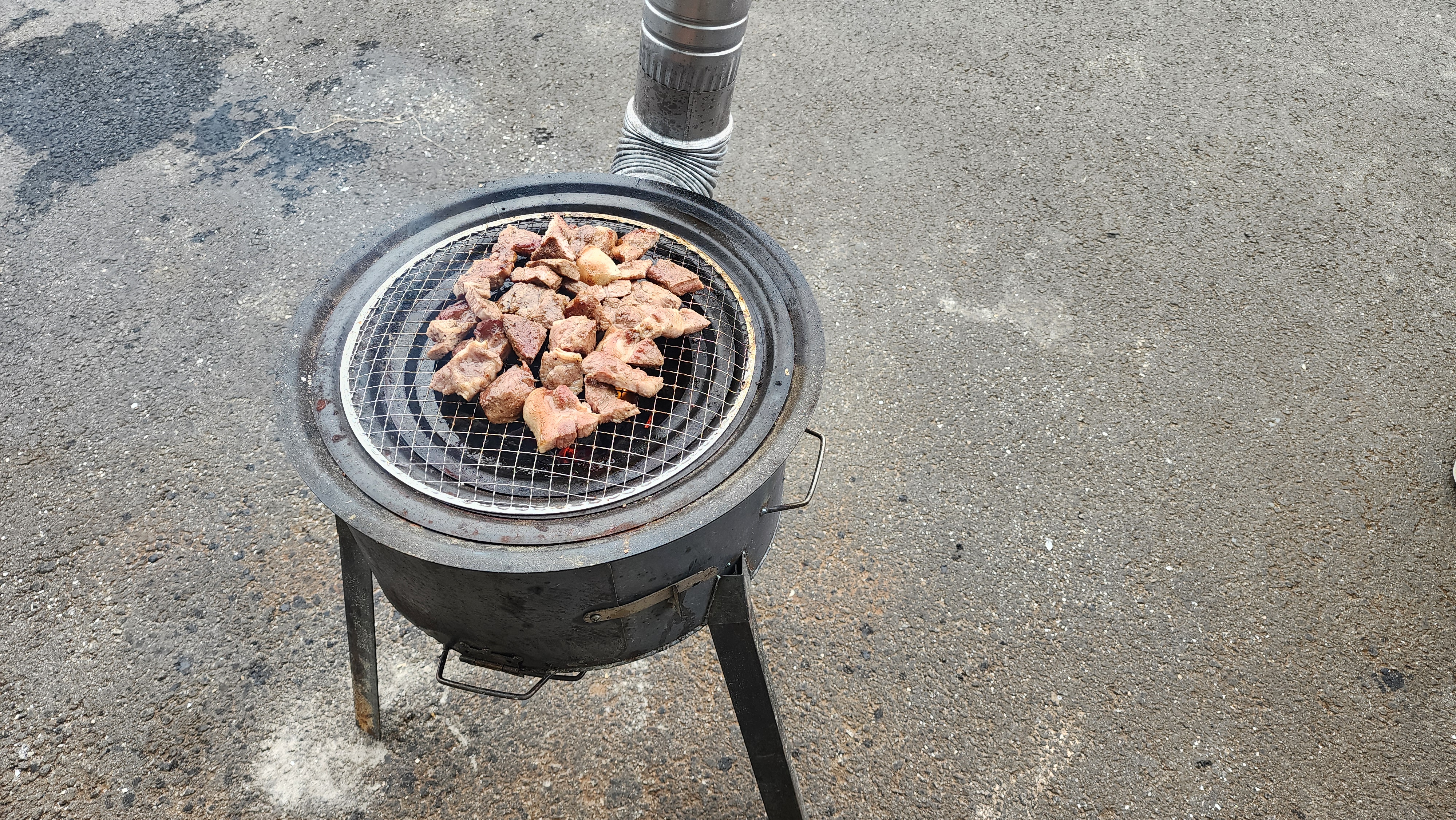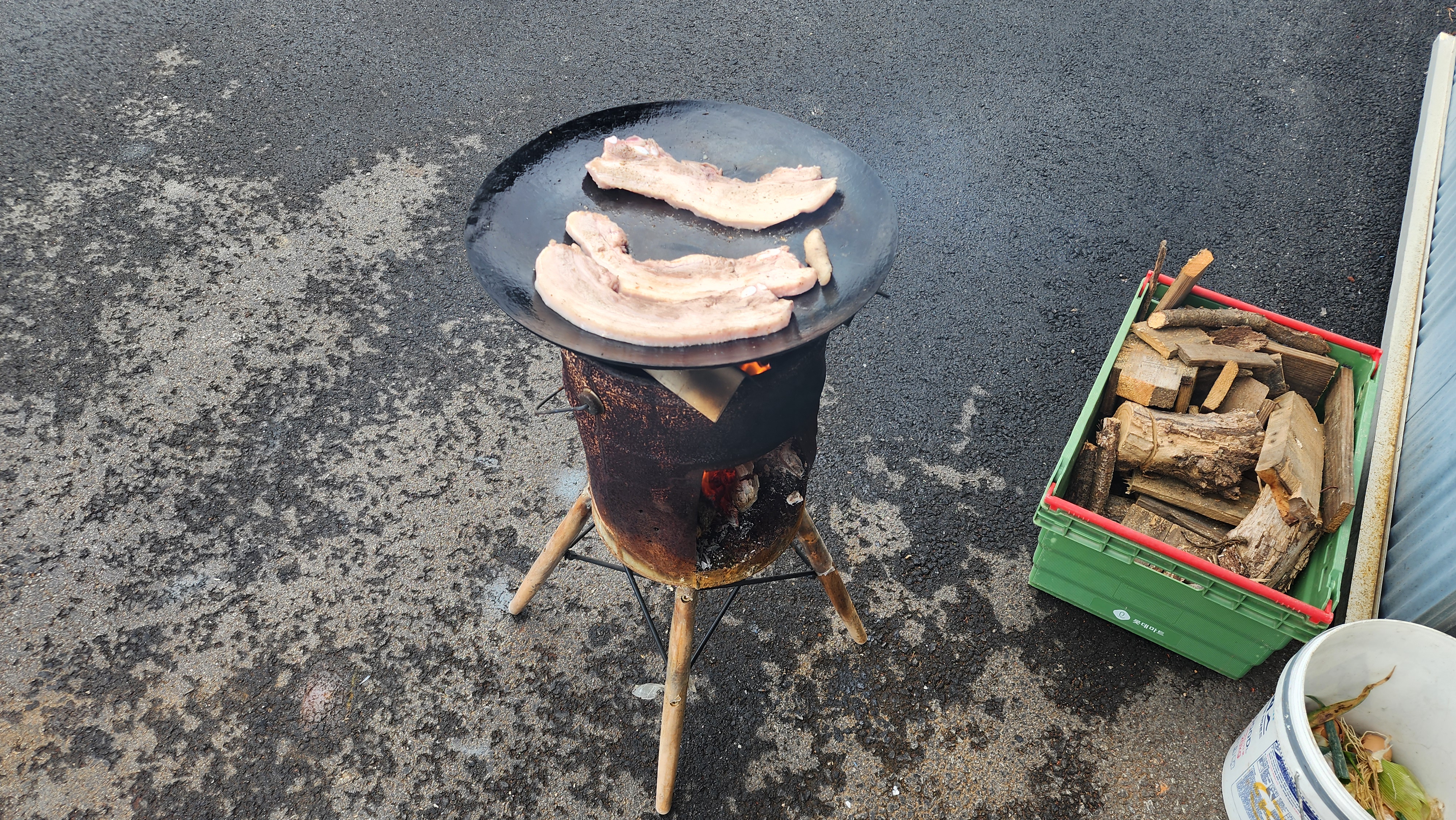 이건 일단, 삼겹살이다. 쉽게 주변에 볼 수 있는 엔진오일 대용량 깡통을 개조해서 만든 화목 바베큐 그릴을 활용해서 솥뚜껑 삼겹살부터 시작했다.
