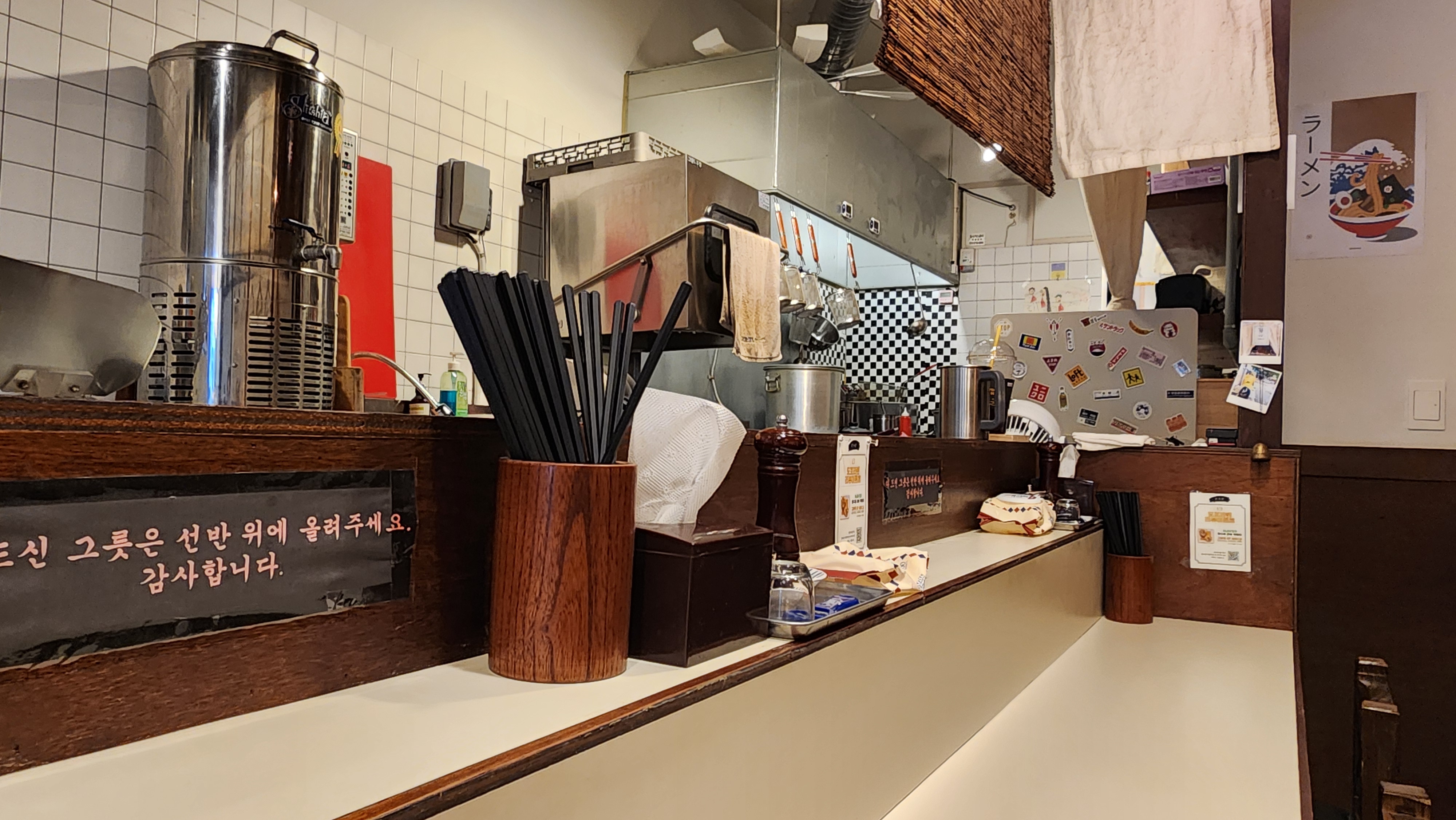라멘집은 작은가게다. 크지 않지만 적당한 테이블과 4인용테이블 하나를 갖춘 작은가게다.