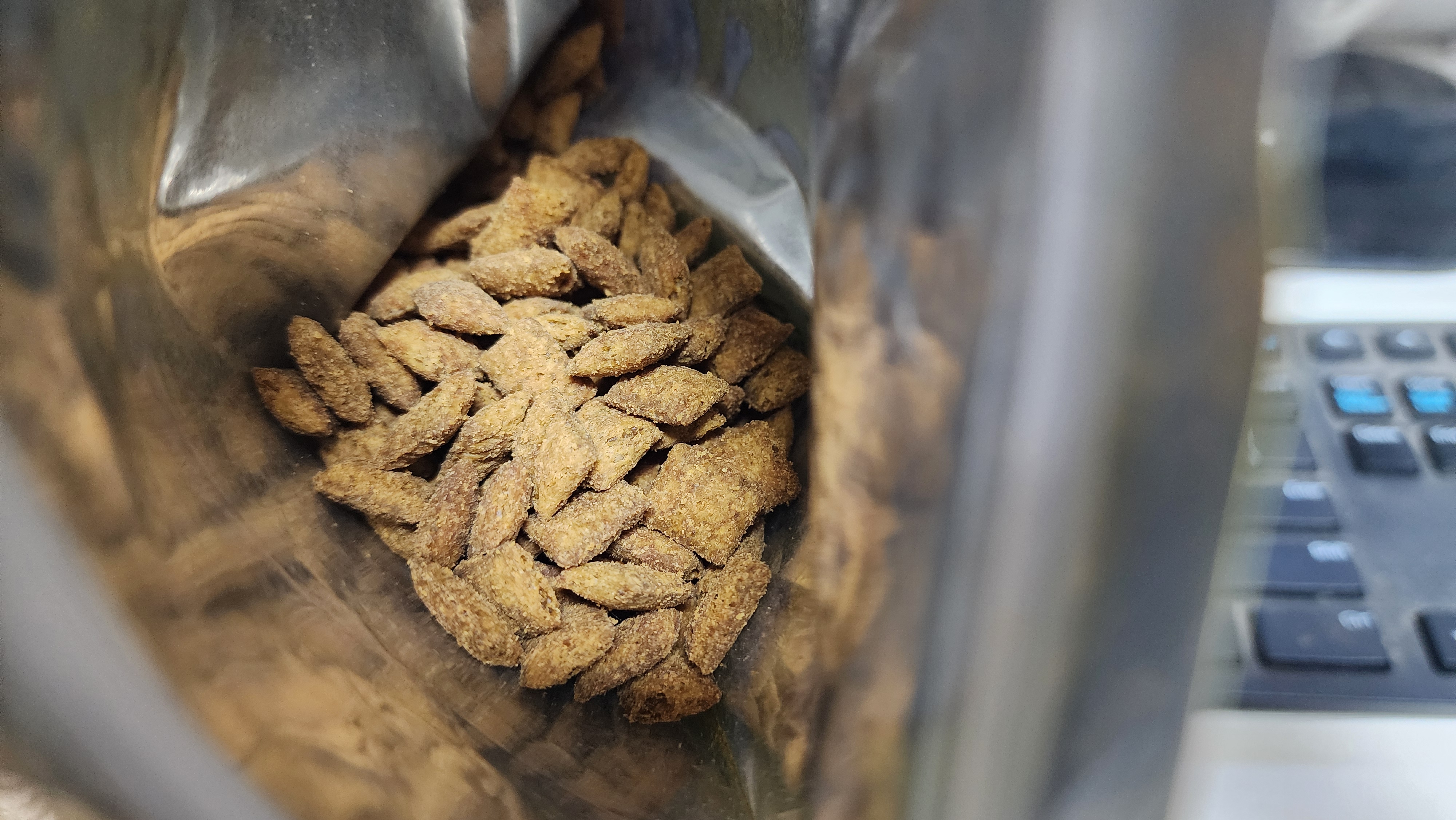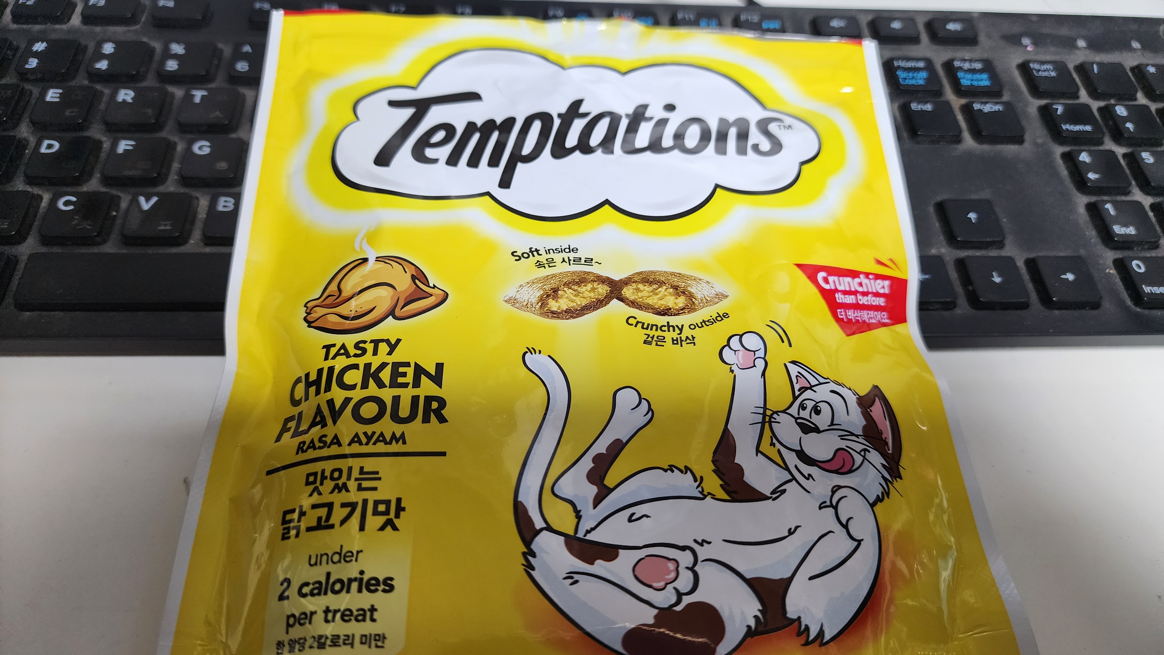 그래서 건식 간식을 찾다가 무인샵에서 구입한 템테이션 작은 봉투를 우연히 보고 그걸 줬는데 잘 먹는다.