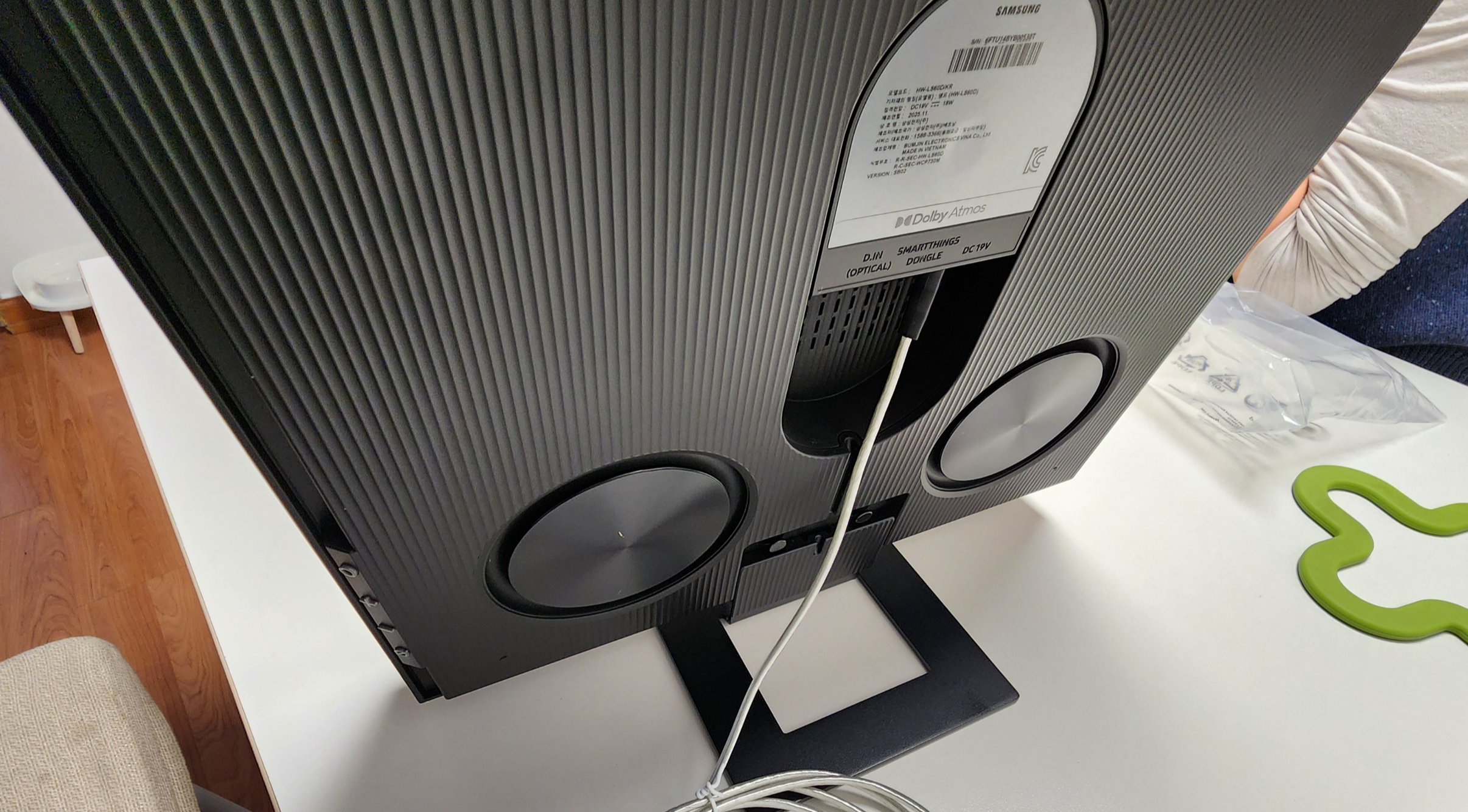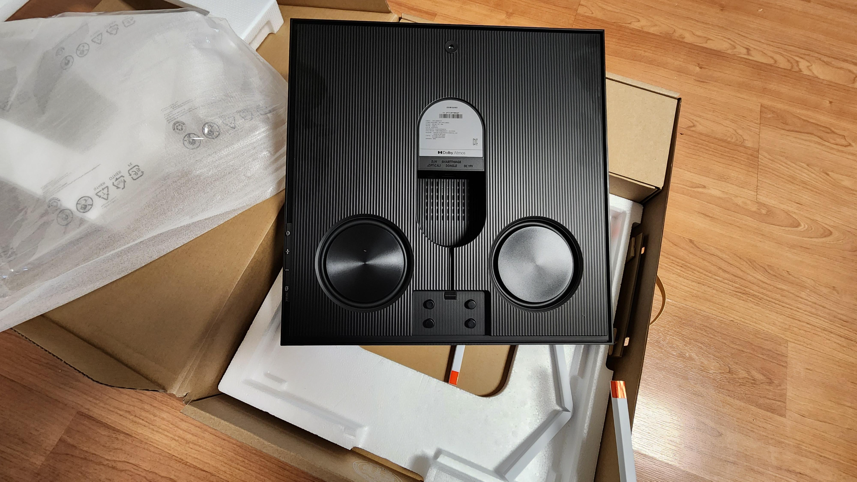 우퍼가 뒤에 붙어 있는데 이걸 벽에 붙이면 층간소음은 어찌할지 모르겠다.